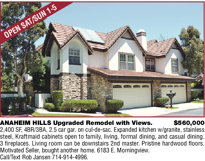 ANAHEIM HILLS Upgraded Remodel with Views. $560,000 2,400 SF, 4BR/3BA, 2.5 car gar. on cul-de-sac. Expanded kitchen w/granite, stainless steel, Kraftmaid cabinets open to family, living, formal dining, and casual dining. 3 fireplaces. Living room can be downstairs 2nd master. Pristine hardwood floors. Motivated Seller, bought another home. 6183 E. Morningview. Call/Text Rob Jansen 714-914-4996.