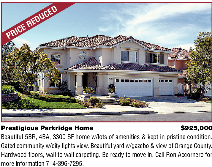 Prestigious Parkridge Home $925,000 Beautiful 5BR, 4BA, 3300 SF home w/lots of amenities & kept in pristine condition. Gated community w/city lights view. Beautiful yard w/gazebo & view of Orange County. Hardwood floors, wall to wall carpeting. Be ready to move in. Call Ron Accornero for more information 714-396-7295.