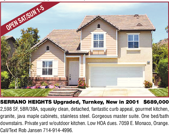 SERRANO HEIGHTS Upgraded, Turnkey, New in 2001 $689,000 2,598 SF, 5BR/3BA, squeaky clean, detached, fantastic curb appeal, gourmet kitchen, granite, java maple cabinets, stainless steel. Gorgeous master suite. One bed/bath downstairs. Private yard w/outdoor kitchen. Low HOA dues. 7059 E. Monaco, Orange. Call/Text Rob Jansen 714-914-4996.