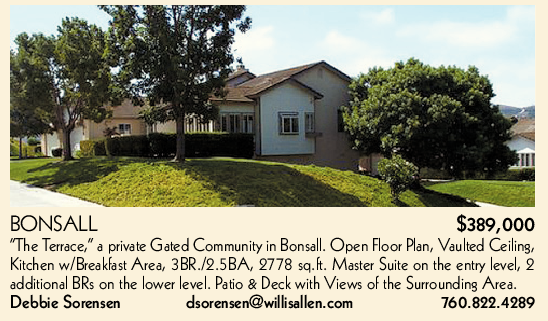 BONSALL $389,000 “The Terrace,” a private Gated Community in Bonsall. Open Floor Plan, Vaulted Ceiling, Kitchen w/Breakfast Area, 3BR./2.5BA, 2778 sq.ft. Master Suite on the entry level, 2 additional BRs on the lower level. Patio & Deck with Views of the Surrounding Area. Debbie Sorensen dsorensen@willisallen.com 760.822.4289