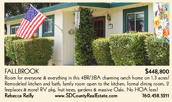 FALLBROOK $448,800 Room for everyone & everything in this 4BR/3BA charming ranch home on 1.3 acres! Remodeled kitchen and bath, family room open to the kitchen, formal dining room, 2 fireplaces & more! RV pkg, fruit trees, gardens & massive Oaks. No HOA fees! Rebecca Reilly www.SDCountyRealEstate.com 760.458.5211