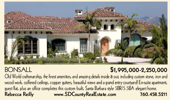 BONSALL $1,995,000-2,250,000 Old World craftsmanship, the finest amenities, and amazing details inside & out, including custom stone, iron and wood work, coffered ceilings, copper gutters, beautiful views and a grand entry courtyard! En-suite apartment, guest flat, plus an office completes this custom built, Santa Barbara style 5BR/5.5BA elegant home. Rebecca Reilly www.SDCountyRealEstate.com 760.458.5211