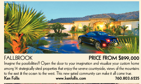 FALLBROOK PRICE FROM $899,000 Imagine the possibilities!! Open the door to your imagination and visualize your custom home among 14 strategically sited properties that enjoy the serene countryside, views of the mountains to the east & the ocean to the west. This new gated community can make it all come true. Ken Follis www.kenfollis.com 760.803.6235