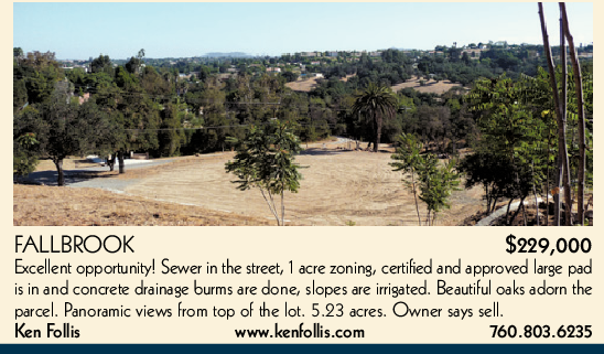 FALLBROOK $229,000 Excellent opportunity! Sewer in the street, 1 acre zoning, certified and approved large pad is in and concrete drainage burms are done, slopes are irrigated. Beautiful oaks adorn the parcel. Panoramic views from top of the lot. 5.23 acres. Owner says sell.