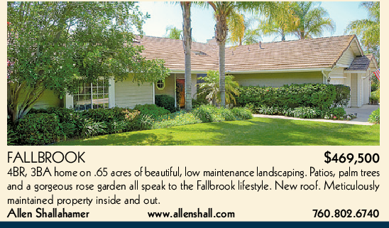 FALLBROOK $469,500 4BR, 3BA home on .65 acres of beautiful, low maintenance landscaping. Patios, palm trees and a gorgeous rose garden all speak to the Fallbrook lifestyle. New roof. Meticulously maintained property inside and out.