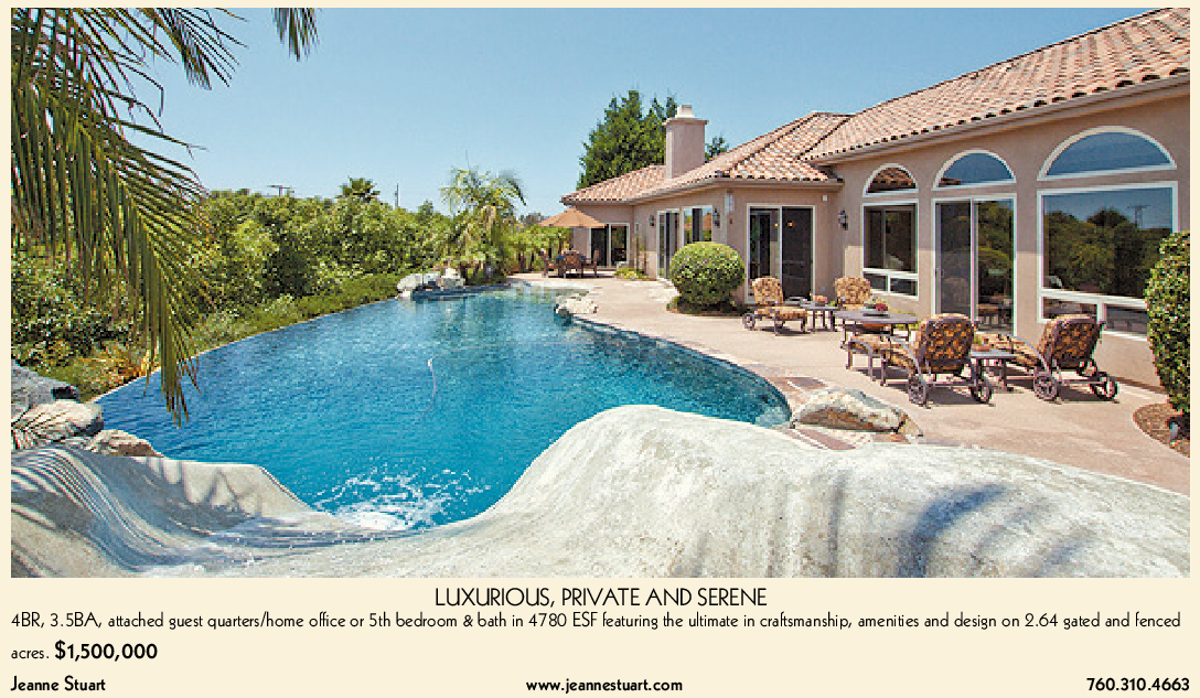 LUXURIOUS, PRIVATE AND SERENE 4BR, 3.5BA, attached guest quarters/home office or 5th bedroom & bath in 4780 ESF featuring the ultimate in craftsmanship, amenities and design on 2.64 gated and fenced acres. $1,500,000 Jeanne Stuart www.jeannestuart.com 760.310.4663