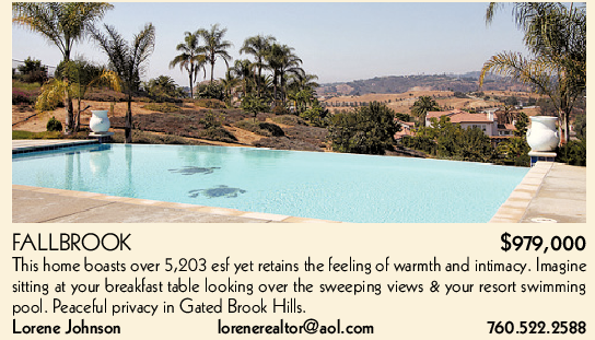 FALLBROOK $979,000 This home boasts over 5,203 esf yet retains the feeling of warmth and intimacy. Imagine sitting at your breakfast table looking over the sweeping views & your resort swimming pool. Peaceful privacy in Gated Brook Hills. Lorene Johnson lorenerealtor@aol.com 760.522.2588