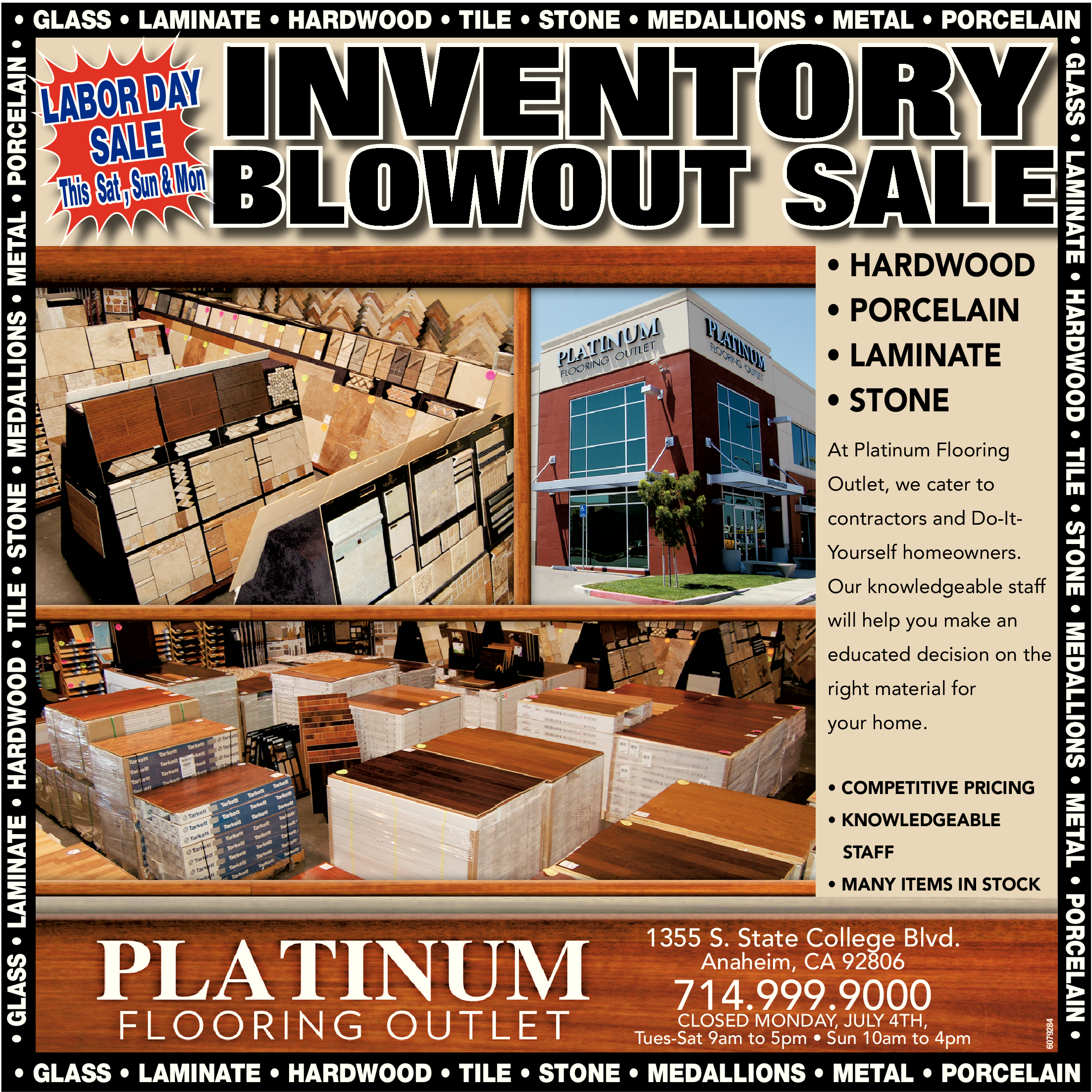 • GLASS • LAMINATE • HARDWOOD • TILE • STONE • MEDALLIONS • METAL • PORCELAIN INVENTORY BLOWOUT SALE • HARDWOOD • PORCELAIN • LAMINATE • STONE At Platinum Flooring Outlet, we cater to contractors and Do-It- Yourself homeowners. Our knowledgeable staff will help you make an educated decision on the right material for your home. • COMPETITIVE PRICING • KNOWLEDGEABLE • GLASS • LAMINATE • HARDWOOD • TILE • STONE • MEDALLIONS • METAL • PORCELAIN STAFF • MANY ITEMS IN STOCK 1355 S. State College Blvd. Anaheim, CA 92806 714.999.9000 CLOSED MONDAY, JULY 4TH, Tues-Sat 9am to 5pm • Sun 10am to 4pm