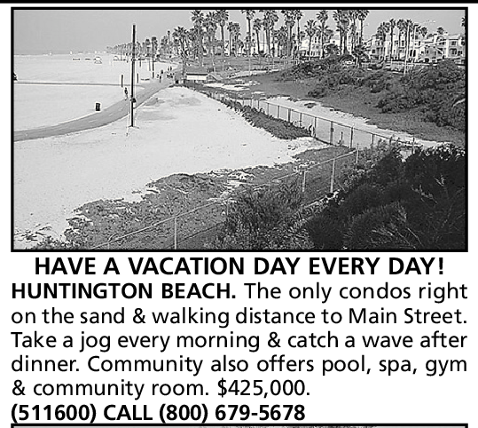HAVE A VACATION DAY EVERY DAY! HUNTINGTON BEACH. The only condos right on the sand & walking distance to Main Street. Take a jog every morning & catch a wave after dinner. Community also offers pool, spa, gym & community room. $425,000. (511600) CALL (800) 679-5678