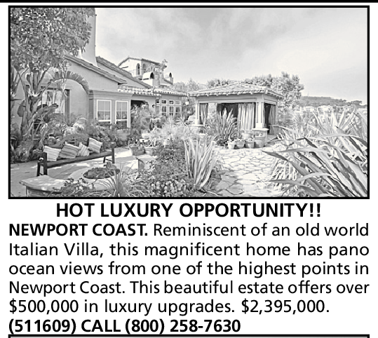 HOT LUXURY OPPORTUNITY!! NEWPORT COAST. Reminiscent of an old world Italian Villa, this magnificent home has pano ocean views from one of the highest points in Newport Coast. This beautiful estate offers over $500,000 in luxury upgrades. $2,395,000. (511609) CALL (800) 258-7630