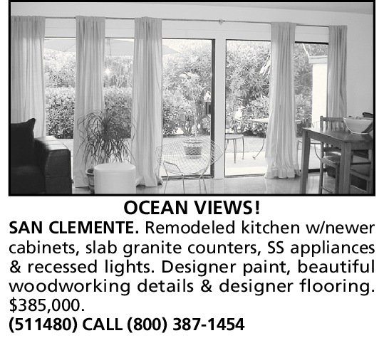 SAN CLEMENTE. Remodeled kitchen w/newer cabinets, slab granite counters, SS appliances & recessed lights. Designer paint, beautiful woodworking details & designer flooring. $385,000. (511480) CALL (800) 387-1454