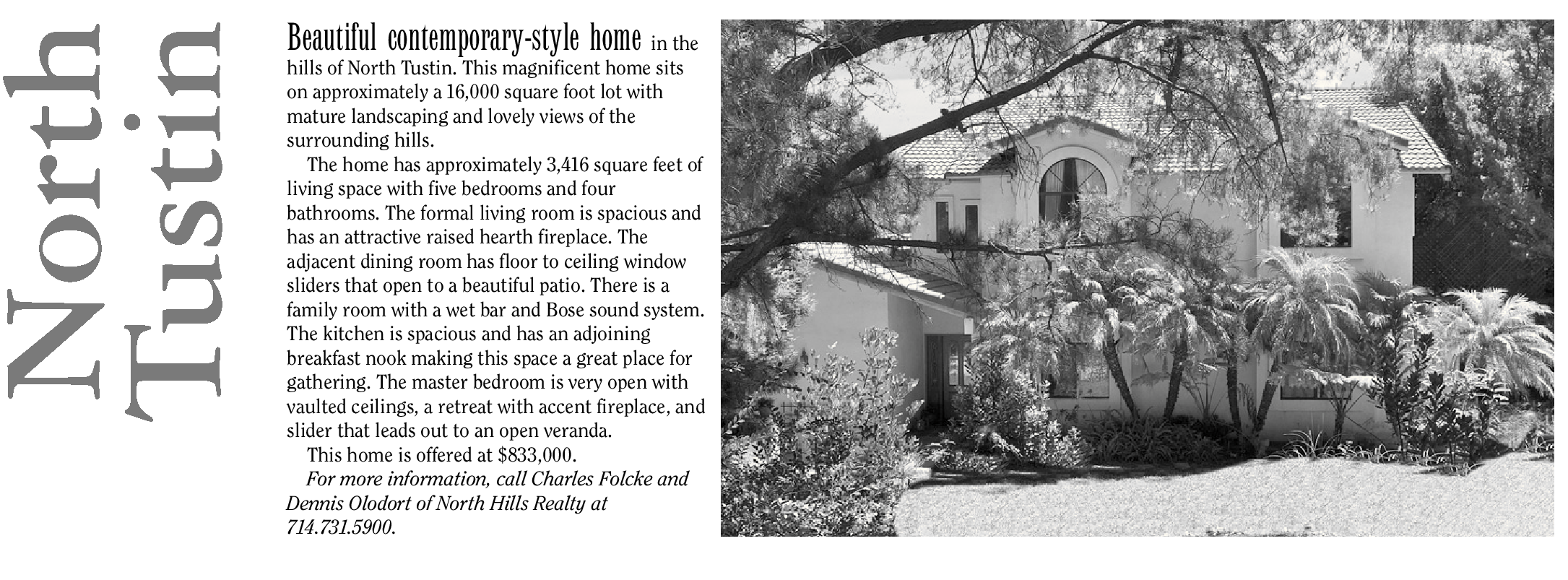 Beautiful contemporary-style home in the hills of North Tustin. This magnificent home sits on approximately a 16,000 square foot lot with mature landscaping and lovely views of the surrounding hills. The home has approximately 3,416 square feet of living space with five bedrooms and four bathrooms. The formal living room is spacious and has an attractive raised hearth fireplace. The adjacent dining room has floor to ceiling window sliders that open to a beautiful patio. There is a family room with a wet bar and Bose sound system. The kitchen is spacious and has an adjoining breakfast nook making this space a great place for gathering. The master bedroom is very open with vaulted ceilings, a retreat with accent fireplace, and slider that leads out to an open veranda. This home is offered at $833,000. For more information, call Charles Folcke and Dennis Olodort of North Hills Realty at 714.731.5900.