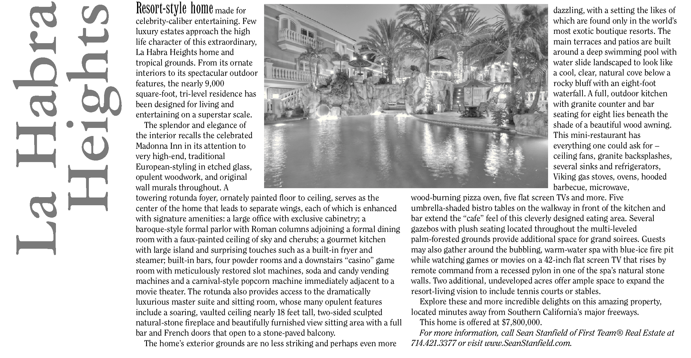 made for celebrity-caliber entertaining. Few luxury estates approach the high life character of this extraordinary, La Habra Heights home and tropical grounds. From its ornate interiors to its spectacular outdoor features, the nearly 9,000 square-foot, tri-level residence has been designed for living and entertaining on a superstar scale.