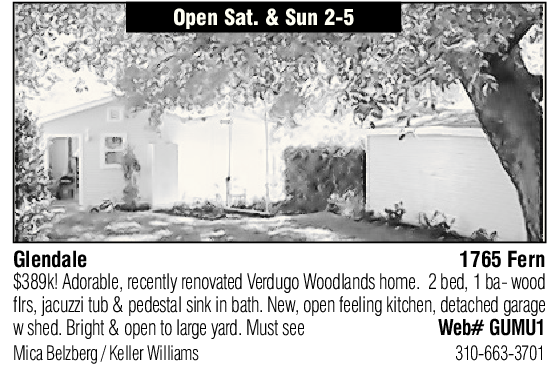 Open Sat. & Sun 2-5 Glendale 1765 Fern $389k! Adorable, recently renovated Verdugo Woodlands home. 2 bed, 1 ba- wood flrs, jacuzzi tub & pedestal sink in bath. New, open feeling kitchen, detached garage w shed. Bright & open to large yard. Must see Web# GUMU1 Mica Belzberg / Keller Williams 310-663-3701