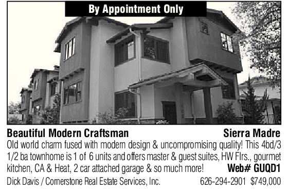 Beautiful Modern Craftsman Sierra Madre Old world charm fused with modern design & uncompromising quality! This 4bd/3 1/2 ba townhome is 1 of 6 units and offers master & guest suites, HW Flrs., gourmet kitchen, CA & Heat, 2 car attached garage & so much more! Web# GUQD1 Dick Davis / Cornerstone Real Estate Services, Inc. 626-294-2901 $749,000