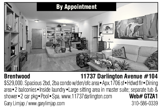 Brentwood 11737 Darlington Avenue #104 $529,000. Spacious 2bd, 2ba condo w/den/ofc area•Apx.1706 sf•Hdwd flr•Dining area•2 balconies•Inside laundry•Large sitting area in master suite; separate tub & shower•2 car pkg•Pool•Spa. www.11737darlington.com Web# GTZA1 Gary Limjap / www.garylimjap.com 310-586-0339
