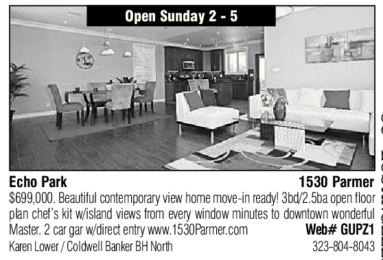 Echo Park 1530 Parmer $699,000. Beautiful contemporary view home move-in ready! 3bd/2.5ba open floor plan chef’s kit w/island views from every window minutes to downtown wonderful Master. 2 car gar w/direct entry www.1530Parmer.com Web# GUPZ1 Karen Lower / Coldwell Banker BH North 323-804-8043