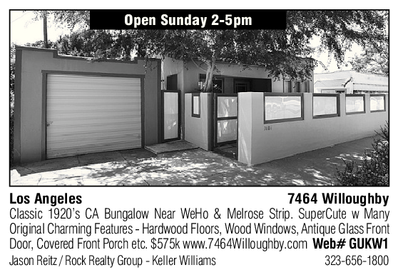 Los Angeles 7464 Willoughby Classic 1920’s CA Bungalow Near WeHo & Melrose Strip. SuperCute w Many Original Charming Features - Hardwood Floors, Wood Windows, Antique Glass Front Door, Covered Front Porch etc. $575k www.7464Willoughby.com Web# GUKW1 Jason Reitz / Rock Realty Group - Keller Williams 323-656-1800