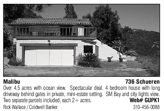 Malibu 736 Schueren Over 4.5 acres with ocean view. Spectacular deal. 4 bedroom house with long driveway behind gates in private, mini-estate setting. SM Bay and city lights view. Two separate parcels included, each 2+ acres. Web# GUPK1 Rick Wallace / Coldwell Banker 310-456-0088