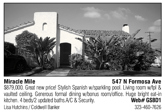 Miracle Mile 547 N Formosa Ave $879,000. Great new price! Stylish Spanish w/sparkling pool. Living room w/fpl & vaulted ceiling. Generous formal dining w/bonus room/office. Huge bright eat-in kitchen. 4 beds/2 updated baths.A/C & Security. Web# GSBD1 Lisa Hutchins / Coldwell Banker 323-460-7626