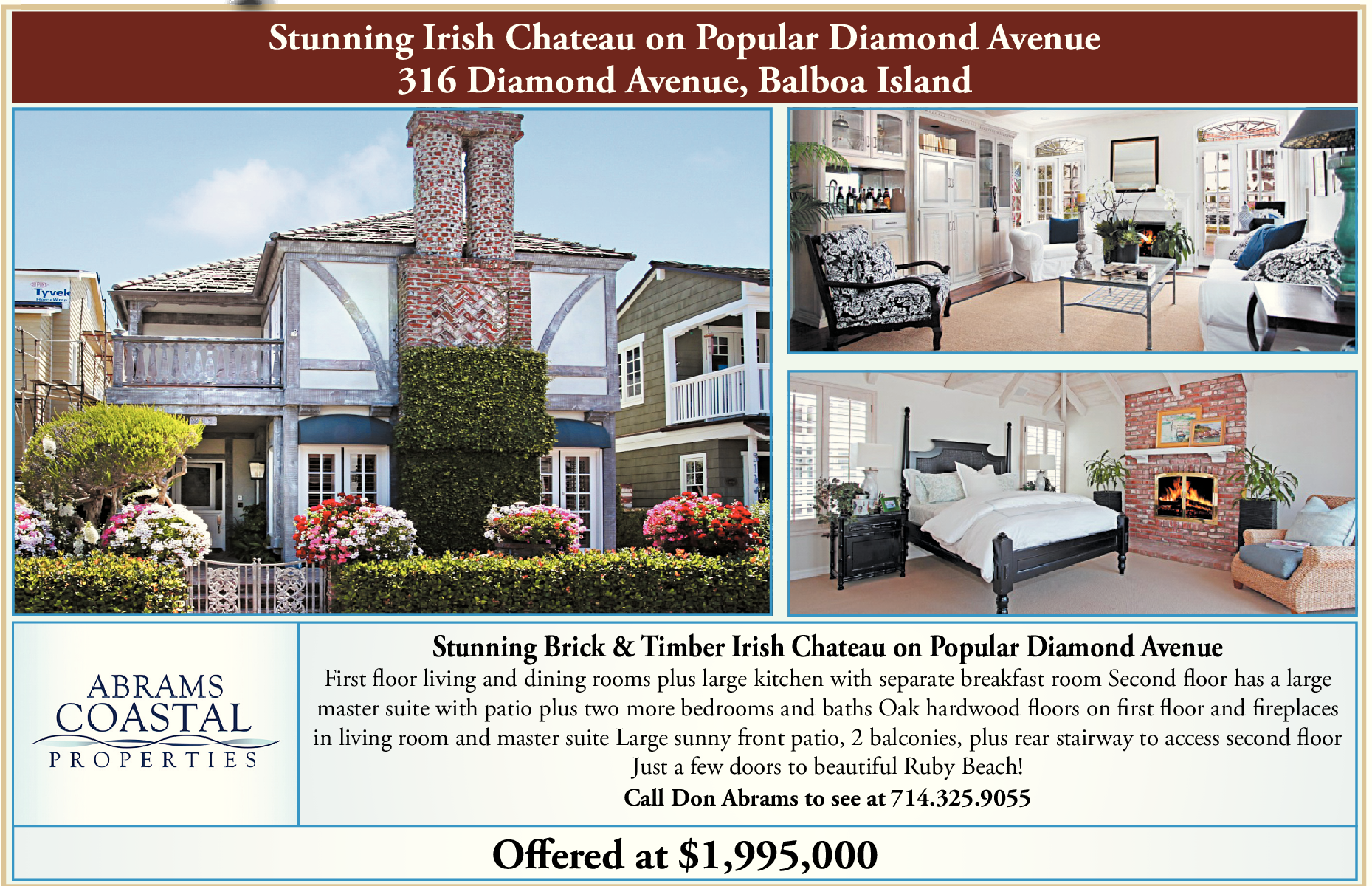 Stunning Irish Chateau on Popular Diamond Avenue 316 Diamond Avenue, Balboa Island Stunning Brick & Timber Irish Chateau on Popular Diamond Avenue First floor living and dining rooms plus large kitchen with separate breakfast room Second floor has a large master suite with patio plus two more bedrooms and baths Oak hardwood floors on first floor and fireplaces in living room and master suite Large sunny front patio, 2 balconies, plus rear stairway to access second floor Just a few doors to beautiful Ruby Beach! Call Don Abrams to see at 714.325.9055 Offered at $1,995,000