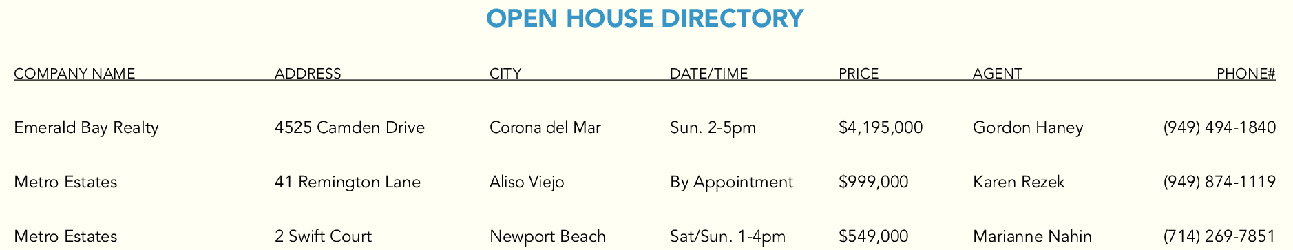 OPEN HOUSE DIRECTORY COMPANY NAME ADDRESS CITY DATE/TIME PRICE AGENT PHONE# Emerald Bay Realty 4525 Camden Drive Corona del Mar Sun. 2-5pm $4,195,000 Gordon Haney (949) 494-1840 Metro Estates 41 Remington Lane Aliso Viejo By Appointment $999,000 Karen Rezek (949) 874-1119 Metro Estates 2 Swift Court Newport Beach Sat/Sun. 1-4pm $549,000 Marianne Nahin (714) 269-7851