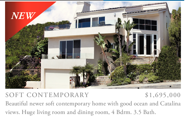 SOFT CONTEMPORARY $1,695,000 Beautiful newer soft contemporary home with good ocean and Catalina views. Huge living room and dining room, 4 Bdrm. 3.5 Bath.