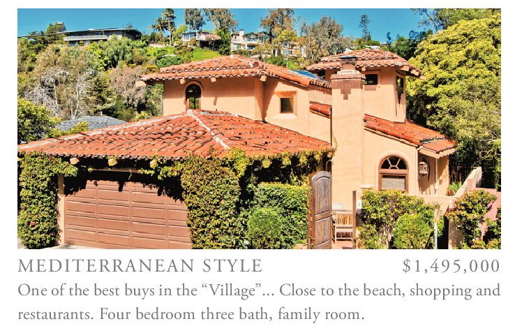 MEDITERRANEAN STYLE $1,495,000 One of the best buys in the “Village”... Close to the beach, shopping and restaurants. Four bedroom three bath, family room.