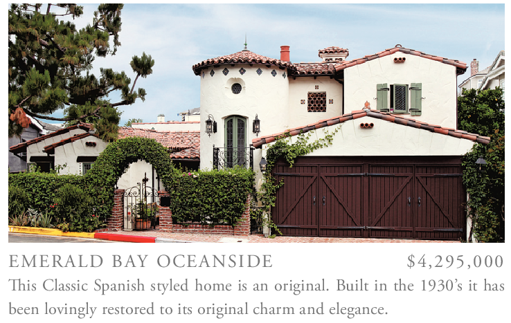 EMERALD BAY OCEANSIDE $4,295,000 This Classic Spanish styled home is an original. Built in the 1930’s it has been lovingly restored to its original charm and elegance.