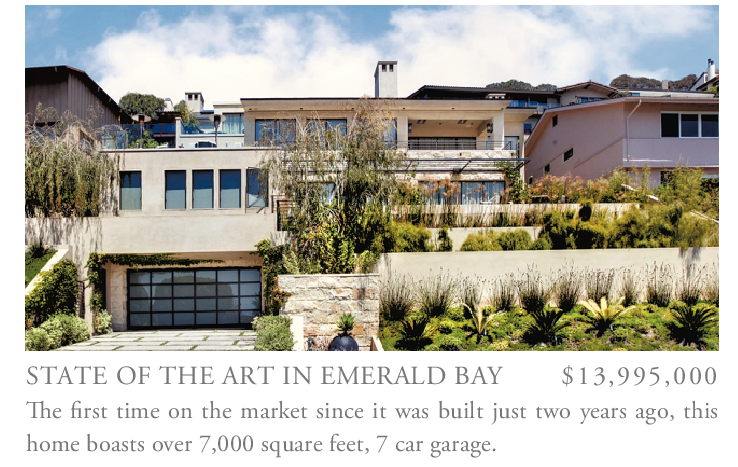 STATE OF THE ART IN EMERALD BAY $13,995,000 The first time on the market since it was built just two years ago, this home boasts over 7,000 square feet, 7 car garage.
