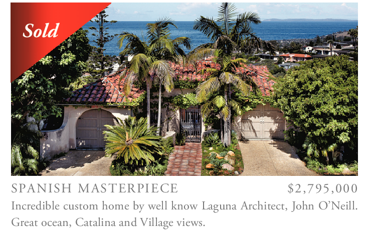SPANISH MASTERPIECE $2,795,000 Incredible custom home by well know Laguna Architect, John O’Neill. Great ocean, Catalina and Village views.