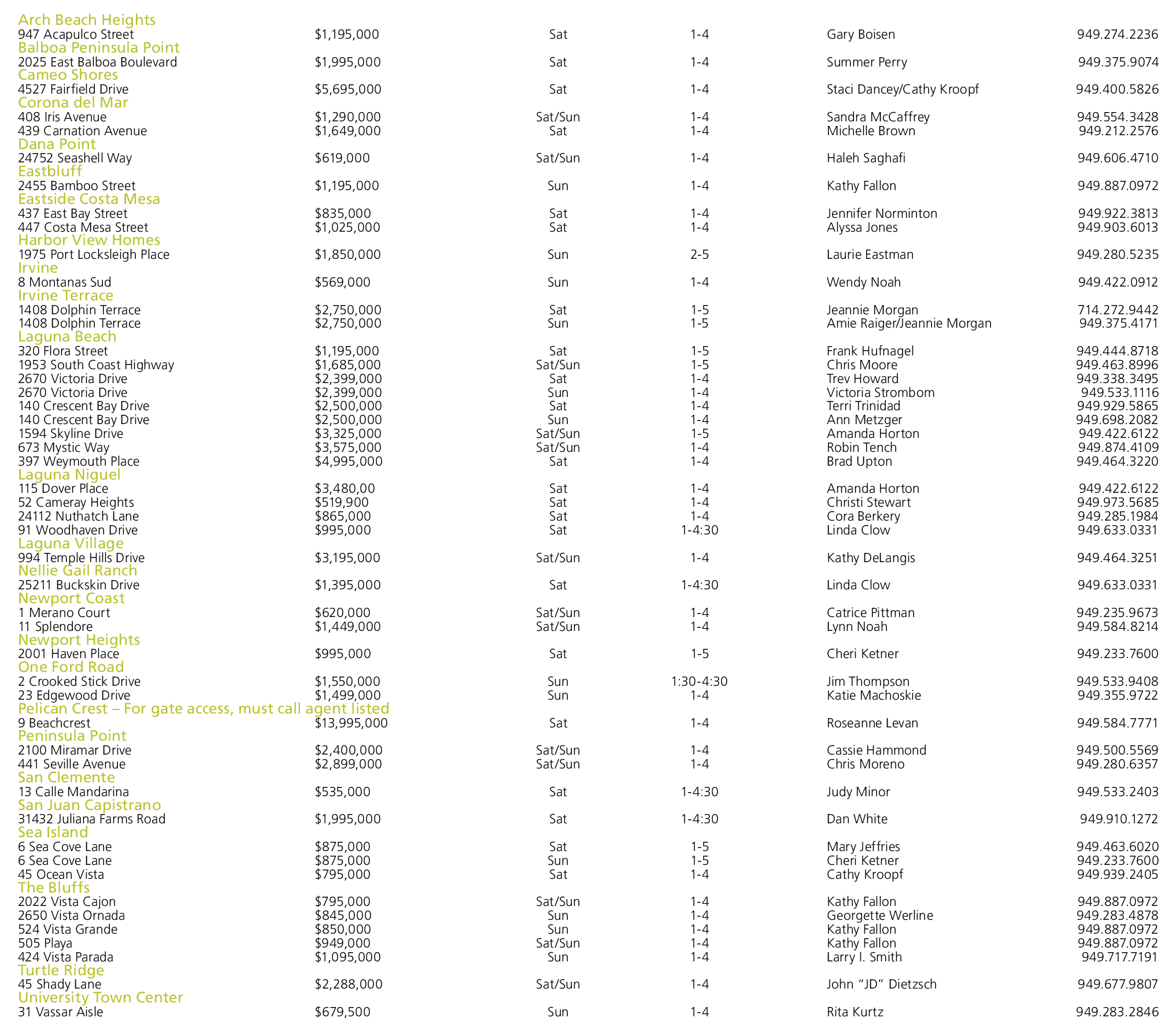 Arch Beach Heights 947 Acapulco Street $1,195,000 Sat 1-4 Gary Boisen 949.274.2236 Balboa Peninsula Point 2025 East Balboa Boulevard $1,995,000 Sat 1-4 Summer Perry 949.375.9074 Cameo Shores 4527 Fairfield Drive $5,695,000 Sat 1-4 Staci Dancey/Cathy Kroopf 949.400.5826 Corona del Mar 408 Iris Avenue $1,290,000 Sat/Sun 1-4 Sandra McCaffrey 949.554.3428 439 Carnation Avenue $1,649,000 Sat 1-4 Michelle Brown 949.212.2576 Dana Point 24752 Seashell Way $619,000 Sat/Sun 1-4 Haleh Saghafi 949.606.4710 Eastbluff 2455 Bamboo Street $1,195,000 Sun 1-4 Kathy Fallon 949.887.0972 Eastside Costa Mesa 437 East Bay Street $835,000 Sat 1-4 Jennifer Norminton 949.922.3813 447 Costa Mesa Street $1,025,000 Sat 1-4 Alyssa Jones 949.903.6013 Harbor View Homes 1975 Port Locksleigh Place $1,850,000 Sun 2-5 Laurie Eastman 949.280.5235 Irvine 8 Montanas Sud $569,000 Sun 1-4 Wendy Noah 949.422.0912 Irvine Terrace 1408 Dolphin Terrace $2,750,000 Sat 1-5 Jeannie Morgan 714.272.9442 1408 Dolphin Terrace $2,750,000 Sun 1-5 Amie Raiger/Jeannie Morgan 949.375.4171 Laguna Beach 320 Flora Street $1,195,000 Sat 1-5 Frank Hufnagel 949.444.8718 1953 South Coast Highway $1,685,000 Sat/Sun 1-5 Chris Moore 949.463.8996 2670 Victoria Drive $2,399,000 Sat 1-4 Trev Howard 949.338.3495 2670 Victoria Drive $2,399,000 Sun 1-4 Victoria Strombom 949.533.1116 140 Crescent Bay Drive $2,500,000 Sat 1-4 Terri Trinidad 949.929.5865 140 Crescent Bay Drive $2,500,000 Sun 1-4 Ann Metzger 949.698.2082 1594 Skyline Drive $3,325,000 Sat/Sun 1-5 Amanda Horton 949.422.6122 673 Mystic Way $3,575,000 Sat/Sun 1-4 Robin Tench 949.874.4109 397 Weymouth Place $4,995,000 Sat 1-4 Brad Upton 949.464.3220 Laguna Niguel 115 Dover Place $3,480,00 Sat 1-4 Amanda Horton 949.422.6122 52 Cameray Heights $519,900 Sat 1-4 Christi Stewart 949.973.5685 24112 Nuthatch Lane $865,000 Sat 1-4 Cora Berkery 949.285.1984 91 Woodhaven Drive $995,000 Sat 1-4:30 Linda Clow 949.633.0331 Laguna Village 994 Temple Hills Drive $3,195,000 Sat/Sun 1-4 Kathy DeLangis 949.464.3251 Nellie Gail Ranch 25211 Buckskin Drive $1,395,000 Sat 1-4:30 Linda Clow 949.633.0331 Newport Coast 1 Merano Court $620,000 Sat/Sun 1-4 Catrice Pittman 949.235.9673 11 Splendore $1,449,000 Sat/Sun 1-4 Lynn Noah 949.584.8214 Newport Heights 2001 Haven Place $995,000 Sat 1-5 Cheri Ketner 949.233.7600 One Ford Road 2 Crooked Stick Drive $1,550,000 Sun 1:30-4:30 Jim Thompson 949.533.9408 23 Edgewood Drive $1,499,000 Sun 1-4 Katie Machoskie 949.355.9722 Pelican Crest – For gate access, must call agent listed 9 Beachcrest $13,995,000 Sat 1-4 Roseanne Levan 949.584.7771 Peninsula Point 2100 Miramar Drive $2,400,000 Sat/Sun 1-4 Cassie Hammond 949.500.5569 441 Seville Avenue $2,899,000 Sat/Sun 1-4 Chris Moreno 949.280.6357 San Clemente 13 Calle Mandarina $535,000 Sat 1-4:30 Judy Minor 949.533.2403 San Juan Capistrano 31432 Juliana Farms Road $1,995,000 Sat 1-4:30 Dan White 949.910.1272 Sea Island 6 Sea Cove Lane $875,000 Sat 1-5 Mary Jeffries 949.463.6020 6 Sea Cove Lane $875,000 Sun 1-5 Cheri Ketner 949.233.7600 45 Ocean Vista $795,000 Sat 1-4 Cathy Kroopf 949.939.2405 The Bluffs 2022 Vista Cajon $795,000 Sat/Sun 1-4 Kathy Fallon 949.887.0972 2650 Vista Ornada $845,000 Sun 1-4 Georgette Werline 949.283.4878 524 Vista Grande $850,000 Sun 1-4 Kathy Fallon 949.887.0972 505 Playa $949,000 Sat/Sun 1-4 Kathy Fallon 949.887.0972 424 Vista Parada $1,095,000 Sun 1-4 Larry I. Smith 949.717.7191 Turtle Ridge 45 Shady Lane $2,288,000 Sat/Sun 1-4 John “JD” Dietzsch 949.677.9807 University Town Center 31 Vassar Aisle $679,500 Sun 1-4 Rita Kurtz 949.283.2846