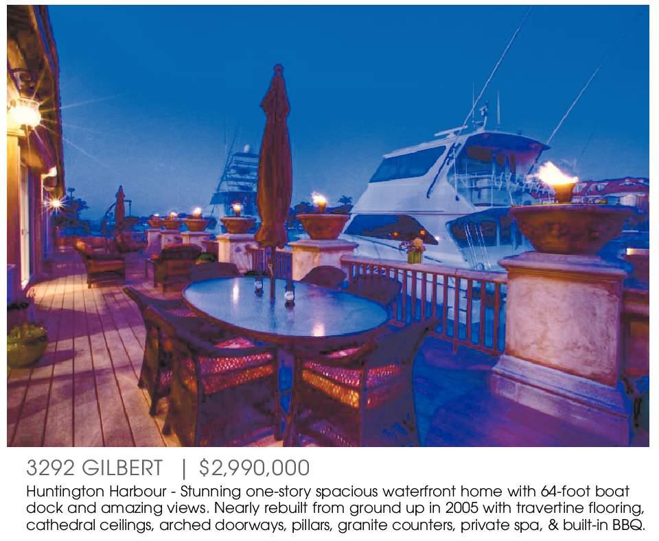 3292 GILBERT | $2,990,000 Huntington Harbour - Stunning one-story spacious waterfront home with 64-foot boat dock and amazing views. Nearly rebuilt from ground up in 2005 with travertine flooring, cathedral ceilings, arched doorways, pillars, granite counters, private spa, & built-in BBQ.