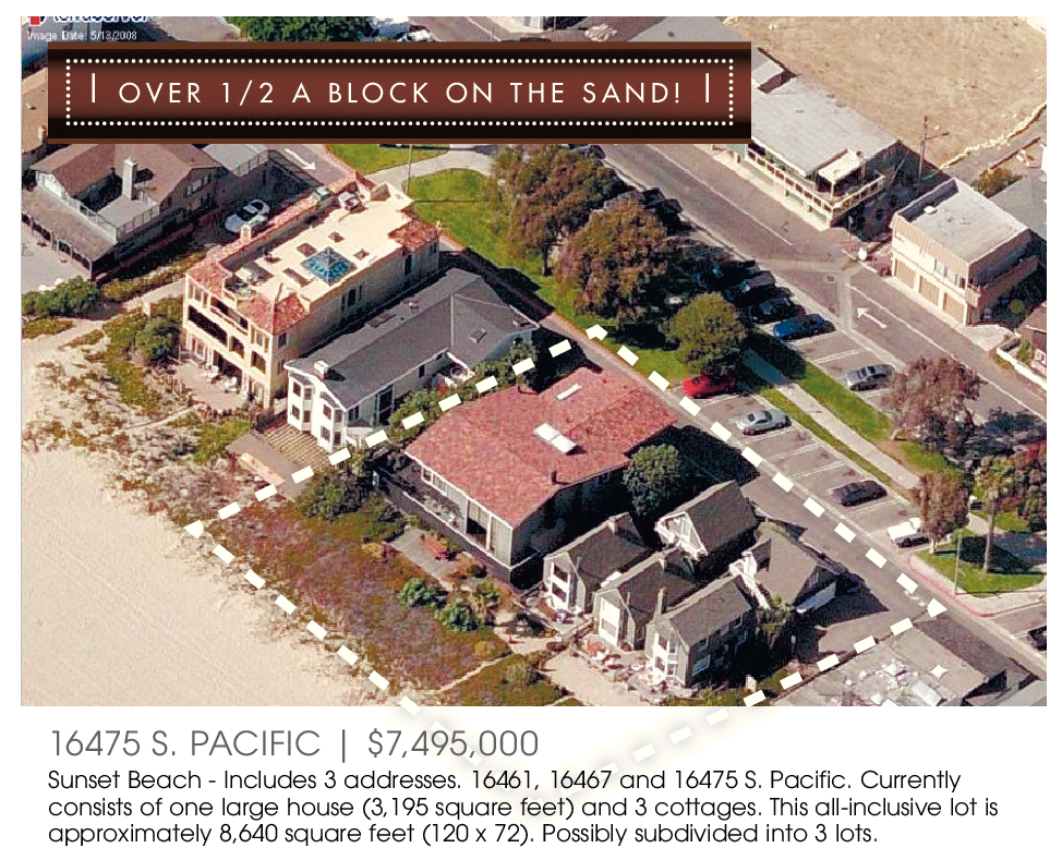 | OVER 1/2 A BLOCK ON THE SAND! | 16475 S. PACIFIC | $7,495,000 Sunset Beach - Includes 3 addresses. 16461, 16467 and 16475 S. Pacific. Currently consists of one large house (3,195 square feet) and 3 cottages. This all-inclusive lot is approximately 8,640 square feet (120 x 72). Possibly subdivided into 3 lots.