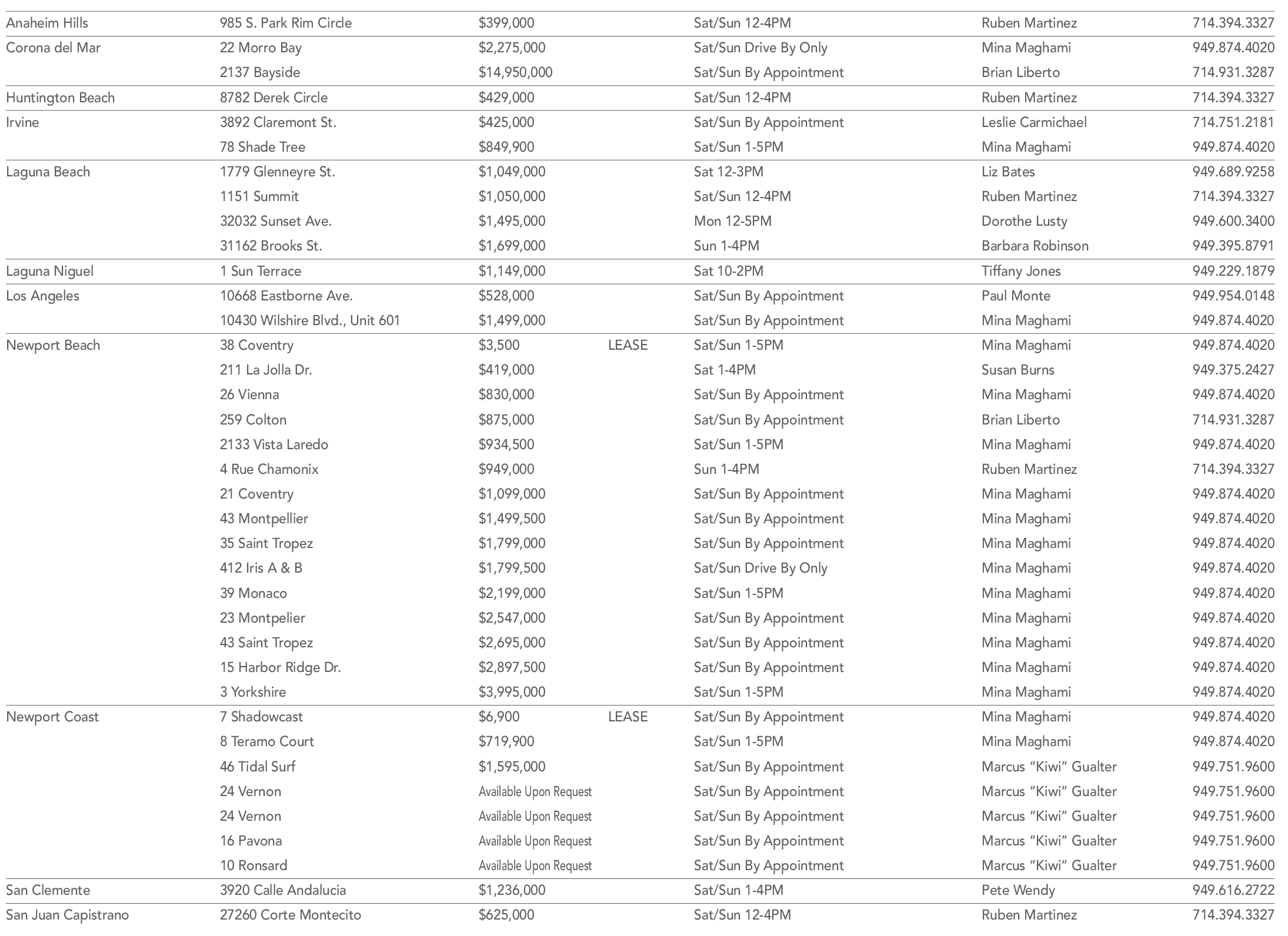 Anaheim Hills 985 S. Park Rim Circle $399,000 Sat/Sun 12-4PM Ruben Martinez 714.394.3327 Corona del Mar 22 Morro Bay $2,275,000 Sat/Sun Drive By Only Mina Maghami 949.874.4020 2137 Bayside $14,950,000 Sat/Sun By Appointment Brian Liberto 714.931.3287 Huntington Beach 8782 Derek Circle $429,000 Sat/Sun 12-4PM Ruben Martinez 714.394.3327 Irvine 3892 Claremont St. $425,000 Sat/Sun By Appointment Leslie Carmichael 714.751.2181 78 Shade Tree $849,900 Sat/Sun 1-5PM Mina Maghami 949.874.4020 Laguna Beach 1779 Glenneyre St. $1,049,000 Sat 12-3PM Liz Bates 949.689.9258 1151 Summit $1,050,000 Sat/Sun 12-4PM Ruben Martinez 714.394.3327 32032 Sunset Ave. $1,495,000 Mon 12-5PM Dorothe Lusty 949.600.3400 31162 Brooks St. $1,699,000 Sun 1-4PM Barbara Robinson 949.395.8791 Laguna Niguel 1 Sun Terrace $1,149,000 Sat 10-2PM Tiffany Jones 949.229.1879 Los Angeles 10668 Eastborne Ave. $528,000 Sat/Sun By Appointment Paul Monte 949.954.0148 10430 Wilshire Blvd., Unit 601 $1,499,000 Sat/Sun By Appointment Mina Maghami 949.874.4020 Newport Beach 38 Coventry $3,500 LEASE Sat/Sun 1-5PM Mina Maghami 949.874.4020 211 La Jolla Dr. $419,000 Sat 1-4PM Susan Burns 949.375.2427 26 Vienna $830,000 Sat/Sun By Appointment Mina Maghami 949.874.4020 259 Colton $875,000 Sat/Sun By Appointment Brian Liberto 714.931.3287 2133 Vista Laredo $934,500 Sat/Sun 1-5PM Mina Maghami 949.874.4020 4 Rue Chamonix $949,000 Sun 1-4PM Ruben Martinez 714.394.3327 21 Coventry $1,099,000 Sat/Sun By Appointment Mina Maghami 949.874.4020 43 Montpellier $1,499,500 Sat/Sun By Appointment Mina Maghami 949.874.4020 35 Saint Tropez $1,799,000 Sat/Sun By Appointment Mina Maghami 949.874.4020 412 Iris A & B $1,799,500 Sat/Sun Drive By Only Mina Maghami 949.874.4020 39 Monaco $2,199,000 Sat/Sun 1-5PM Mina Maghami 949.874.4020 23 Montpelier $2,547,000 Sat/Sun By Appointment Mina Maghami 949.874.4020 43 Saint Tropez $2,695,000 Sat/Sun By Appointment Mina Maghami 949.874.4020 15 Harbor Ridge Dr. $2,897,500 Sat/Sun By Appointment Mina Maghami 949.874.4020 3 Yorkshire $3,995,000 Sat/Sun 1-5PM Mina Maghami 949.874.4020 Newport Coast 7 Shadowcast $6,900 LEASE Sat/Sun By Appointment Mina Maghami 949.874.4020 8 Teramo Court $719,900 Sat/Sun 1-5PM Mina Maghami 949.874.4020 46 Tidal Surf $1,595,000 Sat/Sun By Appointment Marcus “Kiwi” Gualter 949.751.9600 24 Vernon Available Upon Request Sat/Sun By Appointment Marcus “Kiwi” Gualter 949.751.9600 24 Vernon Available Upon Request Sat/Sun By Appointment Marcus “Kiwi” Gualter 949.751.9600 16 Pavona Available Upon Request Sat/Sun By Appointment Marcus “Kiwi” Gualter 949.751.9600 10 Ronsard Available Upon Request Sat/Sun By Appointment Marcus “Kiwi” Gualter 949.751.9600 San Clemente 3920 Calle Andalucia $1,236,000 Sat/Sun 1-4PM Pete Wendy 949.616.2722 San Juan Capistrano 27260 Corte Montecito $625,000 Sat/Sun 12-4PM Ruben Martinez 714.394.3327