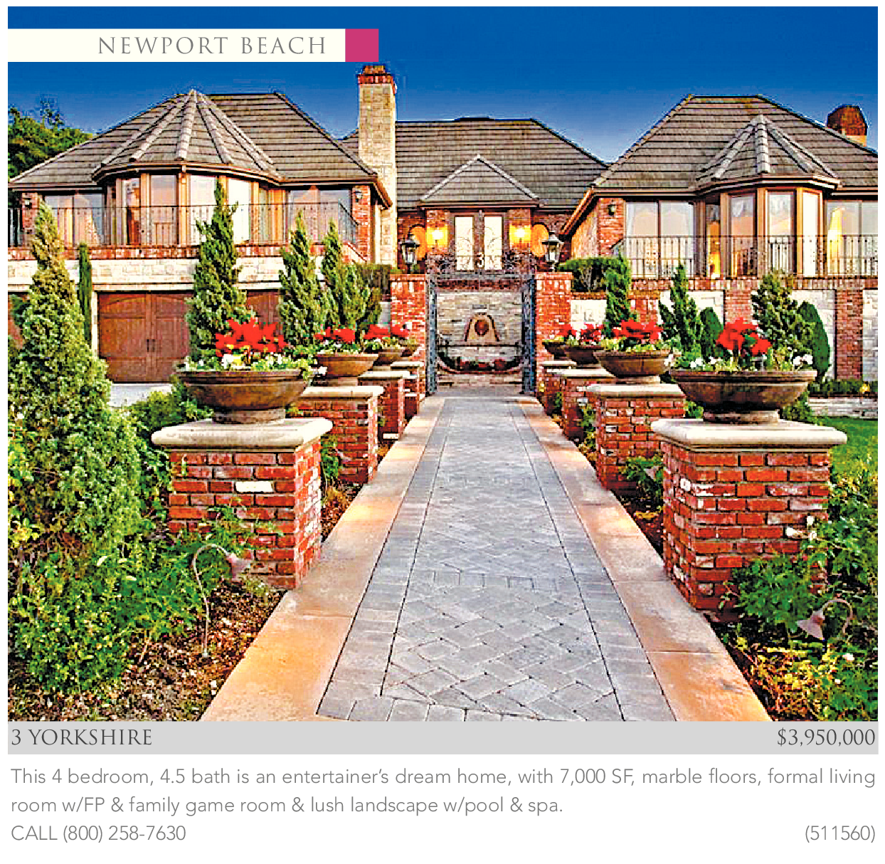This 4 bedroom, 4.5 bath is an entertainer’s dream home, with 7,000 SF, marble floors, formal living room w/FP & family game room & lush landscape w/pool & spa. CALL (800) 258-7630 (511560)