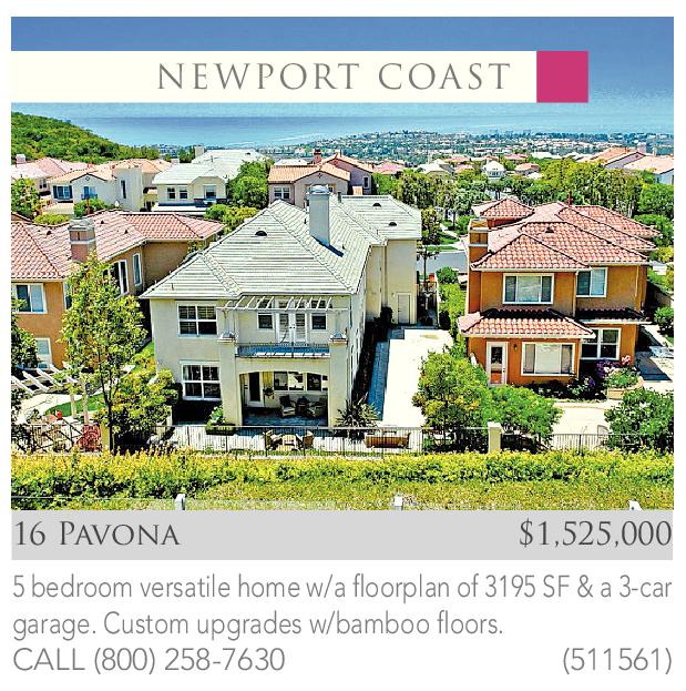 16 Pavona $1,525,000 5 bedroom versatile home w/a floorplan of 3195 SF & a 3-car garage. Custom upgrades w/bamboo floors. CALL (800) 258-7630 (511561)