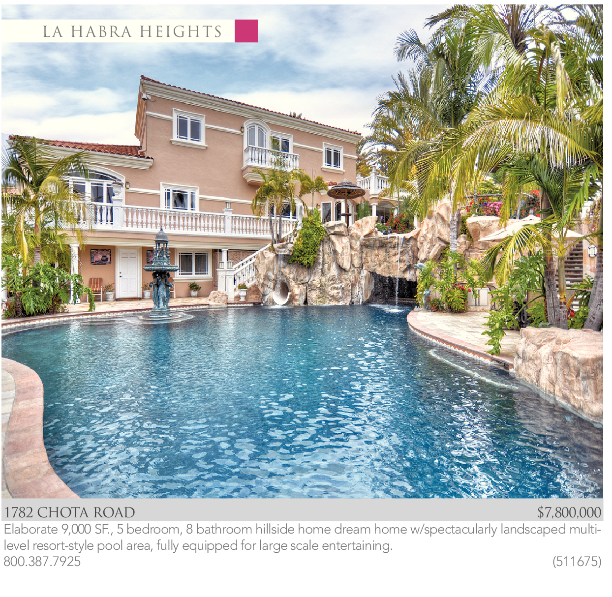 1782 CHOTA ROAD $7,800,000 Elaborate 9,000 SF., 5 bedroom, 8 bathroom hillside home dream home w/spectacularly landscaped multilevel resort-style pool area, fully equipped for large scale entertaining.