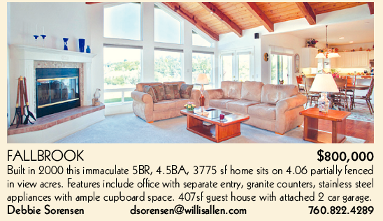 FALLBROOK $800,000 Built in 2000 this immaculate 5BR, 4.5BA, 3775 sf home sits on 4.06 partially fenced in view acres. Features include office with separate entry, granite counters, stainless steel appliances with ample cupboard space. 407sf guest house with attached 2 car garage. Debbie Sorensen dsorensen@willisallen.com 760.822.4289