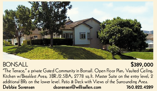 BONSALL $389,000 “The Terrace,” a private Gated Community in Bonsall. Open Floor Plan, Vaulted Ceiling, Kitchen w/Breakfast Area, 3BR./2.5BA, 2778 sq.ft. Master Suite on the entry level, 2 additional BRs on the lower level. Patio & Deck with Views of the Surrounding Area. Debbie Sorensen dsorensen@willisallen.com 760.822.4289