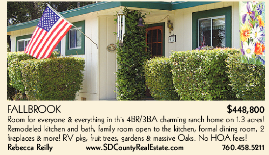 FALLBROOK $448,800 Room for everyone & everything in this 4BR/3BA charming ranch home on 1.3 acres! Remodeled kitchen and bath, family room open to the kitchen, formal dining room, 2 fireplaces & more! RV pkg, fruit trees, gardens & massive Oaks. No HOA fees! Rebecca Reilly www.SDCountyRealEstate.com 760.458.5211
