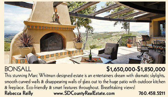 BONSALL $1,650,000-$1,850,000 This stunning Marc Whitman designed estate is an entertainers dream with dramatic skylights, smooth curved walls & disappearing walls of glass out to the huge patio with outdoor kitchen & fireplace. Eco-friendly & smart features throughout. Breathtaking views! Rebecca Reilly www.SDCountyRealEstate.com 760.458.5211