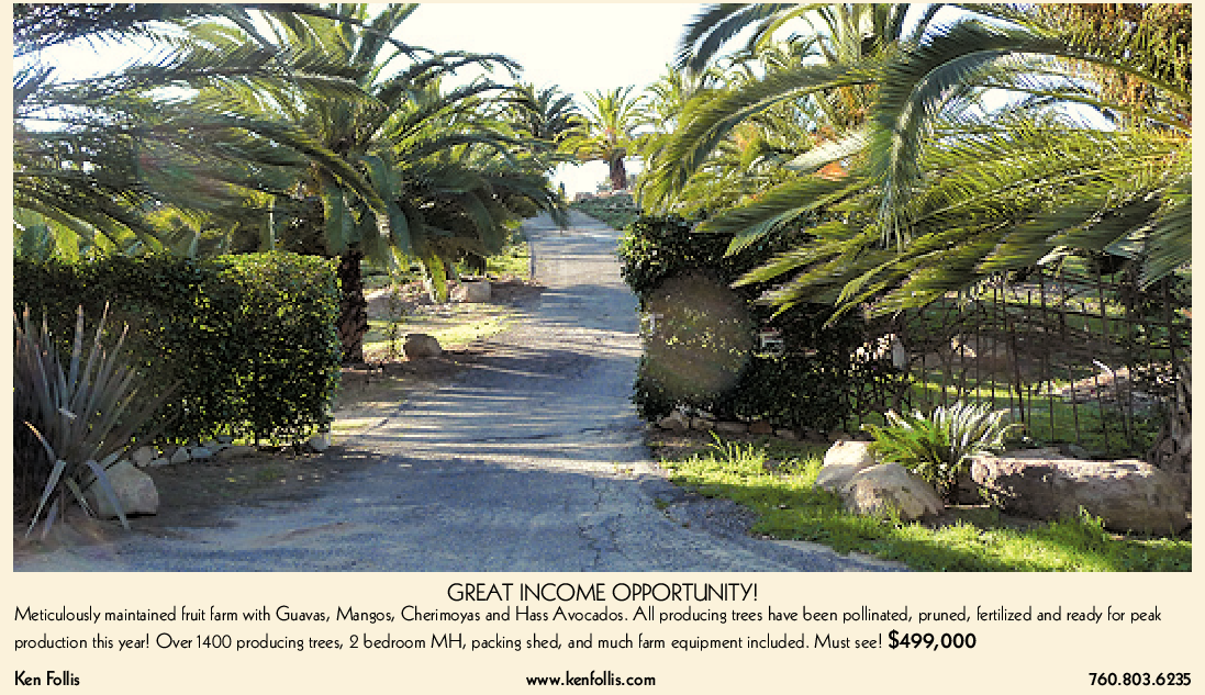Meticulously maintained fruit farm with Guavas, Mangos, Cherimoyas and Hass Avocados. All producing trees have been pollinated, pruned, fertilized and ready for peak production this year! Over 1400 producing trees, 2 bedroom MH, packing shed, and much farm equipment included. Must see! $499,000 Ken Follis www.kenfollis.com 760.803.6235