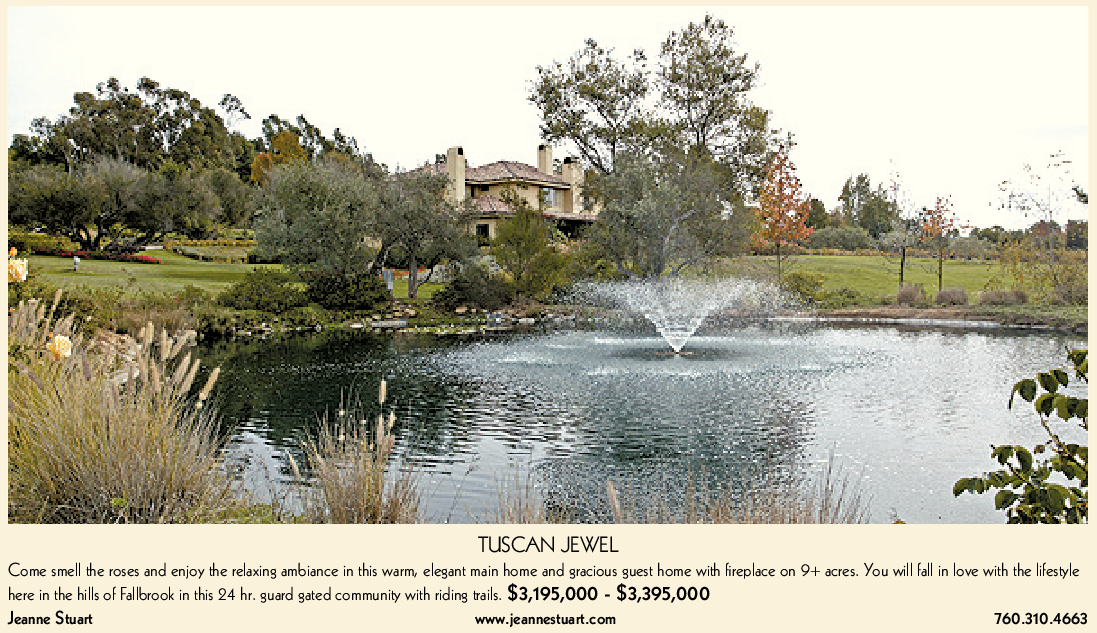 TUSCAN JEWEL Come smell the roses and enjoy the relaxing ambiance in this warm, elegant main home and gracious guest home with fireplace on 9+ acres. You will fall in love with the lifestyle here in the hills of Fallbrook in this 24 hr. guard gated community with riding trails. $3,195,000 - $3,395,000 Jeanne Stuart www.jeannestuart.com 760.310.4663
