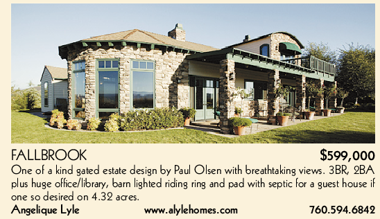 FALLBROOK $599,000 One of a kind gated estate design by Paul Olsen with breathtaking views. 3BR, 2BA plus huge office/library, barn lighted riding ring and pad with septic for a guest house if one so desired on 4.32 acres. Angelique Lyle www.alylehomes.com 760.594.6842