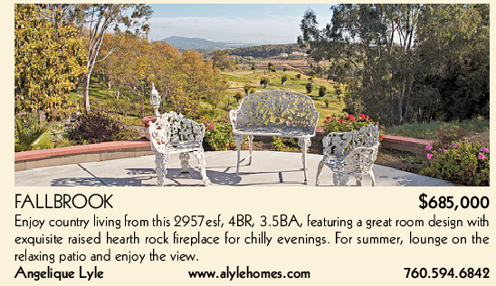 FALLBROOK $685,000 Enjoy country living from this 2957esf, 4BR, 3.5BA, featuring a great room design with exquisite raised hearth rock fireplace for chilly evenings. For summer, lounge on the relaxing patio and enjoy the view. Angelique Lyle www.alylehomes.com 760.594.6842