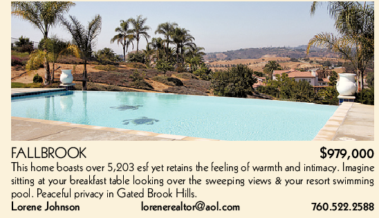 FALLBROOK $979,000 This home boasts over 5,203 esf yet retains the feeling of warmth and intimacy. Imagine sitting at your breakfast table looking over the sweeping views & your resort swimming pool. Peaceful privacy in Gated Brook Hills. Lorene Johnson lorenerealtor@aol.com 760.522.2588