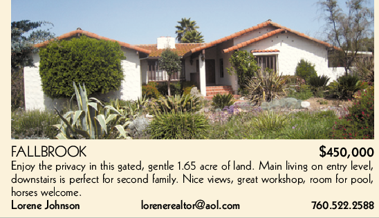 FALLBROOK $450,000 Enjoy the privacy in this gated, gentle 1.65 acre of land. Main living on entry level, downstairs is perfect for second family. Nice views, great workshop, room for pool, horses welcome. Lorene Johnson lorenerealtor@aol.com 760.522.2588