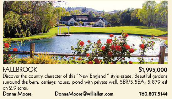 FALLBROOK $1,995,000 Discover the country character of this “New England “ style estate. Beautiful gardens surround the barn, carriage house, pond with private well. 5BR/5.5BA, 5,879 esf on 2.9 acres. Donna Moore DonnaMoore@williallen.com 760.807.5144