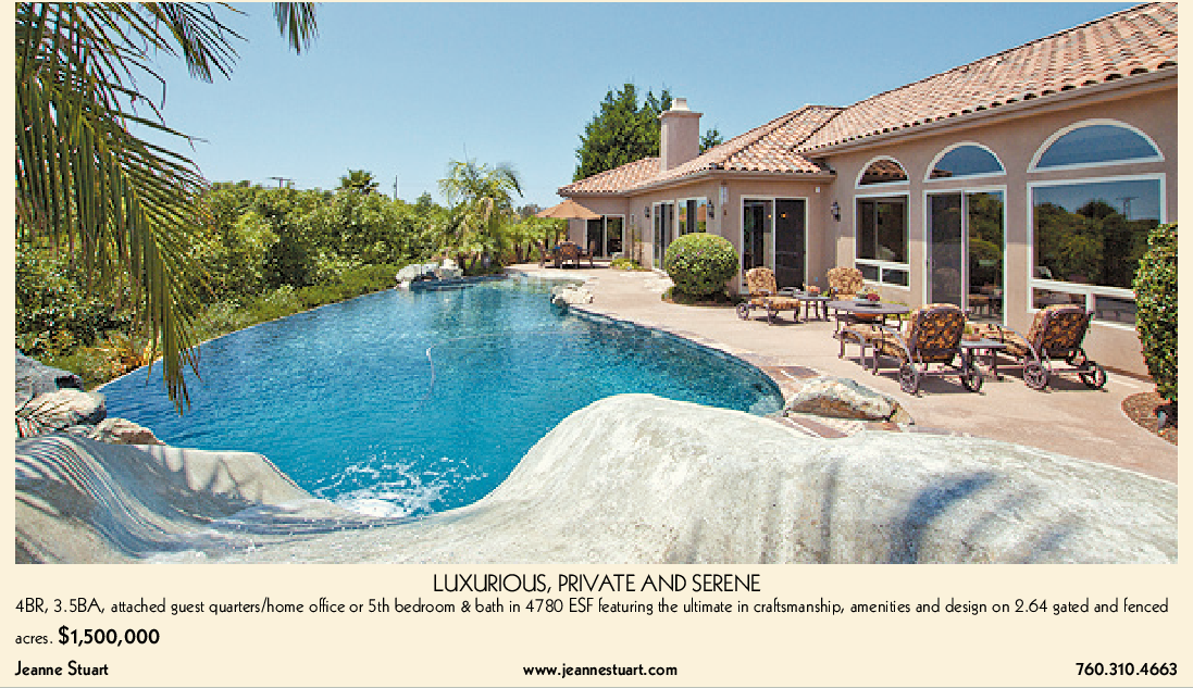760.522.2588 760.522.2588 LUXURIOUS, PRIVATE AND SERENE 4BR, 3.5BA, attached guest quarters/home office or 5th bedroom & bath in 4780 ESF featuring the ultimate in craftsmanship, amenities and design on 2.64 gated and fenced acres. $1,500,000 Jeanne Stuart www.jeannestuart.com 760.310.4663